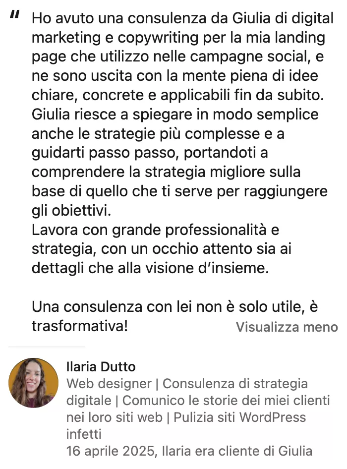 Autrice del blog “La Strategist Onesta” e di decine di post “caffeinomani” su LinkedIn che macinano commenti e condivisioni ogni settimana.
