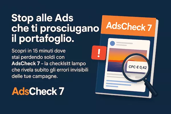 Scopri in 15 minuti dove stai perdendo soldi con AdsCheck 7 – la checklist lampo che rivela subito gli errori invisibili delle tue campagne.